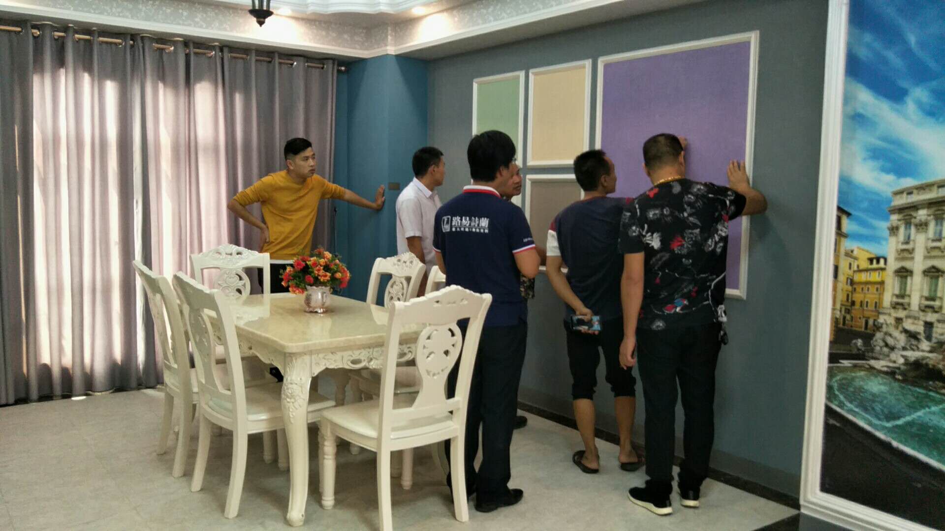 从一楼到三楼,一行人一路看着样板来到展厅,对墙身艺术涂料、挂饰样板、旋转样板仔细的欣赏。